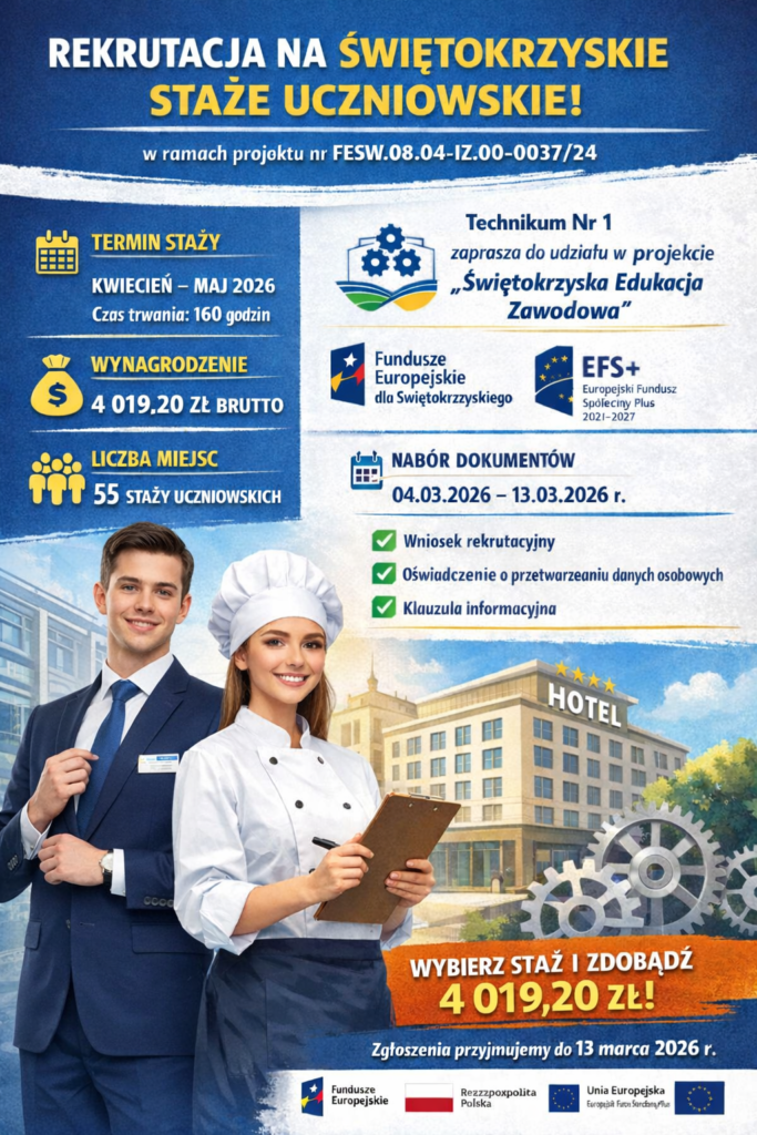 Zespół Szkół Ponadpodstawowych im. Mikołaja Kopernika w Busku-Zdroju ogłasza nabór uczniów i uczennic Technikum Nr 1 do udziału płatnych stażach uczniowskich w ramach projektu „Świętokrzyska Edukacja Zawodowa”.