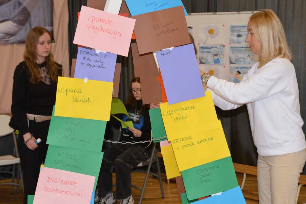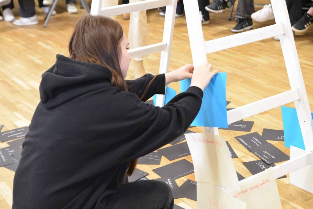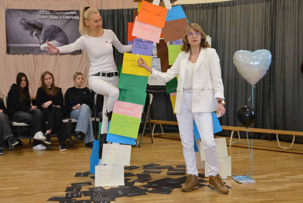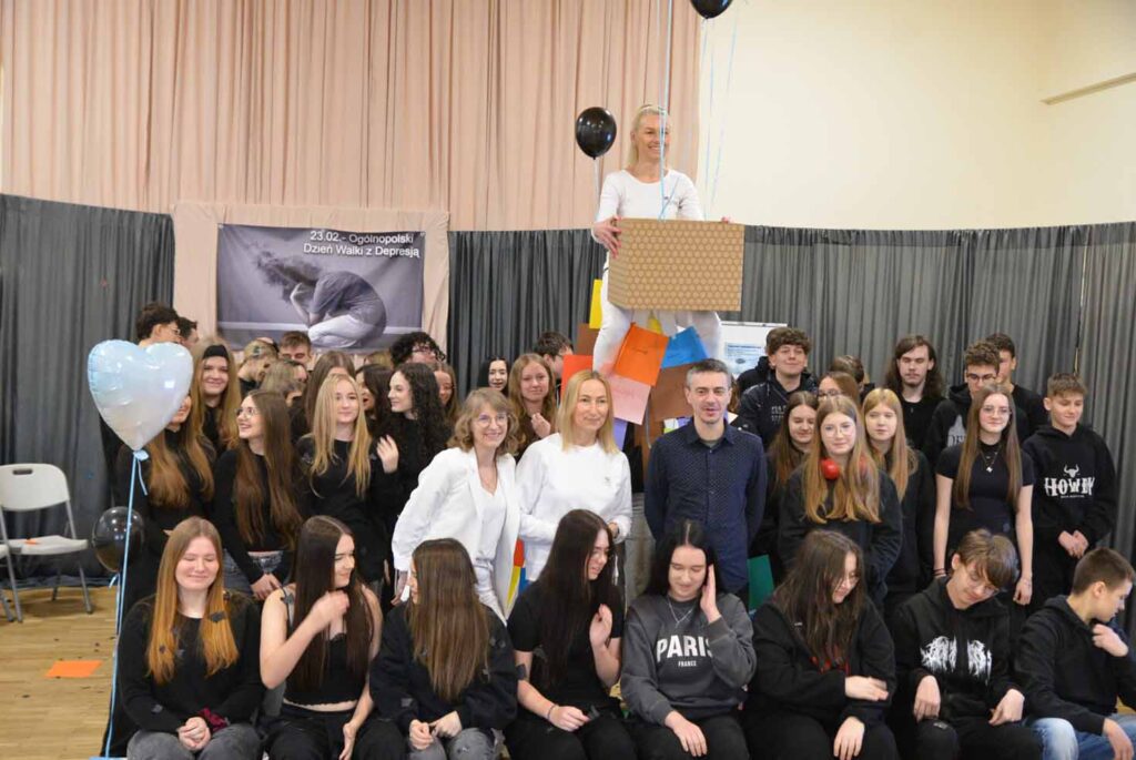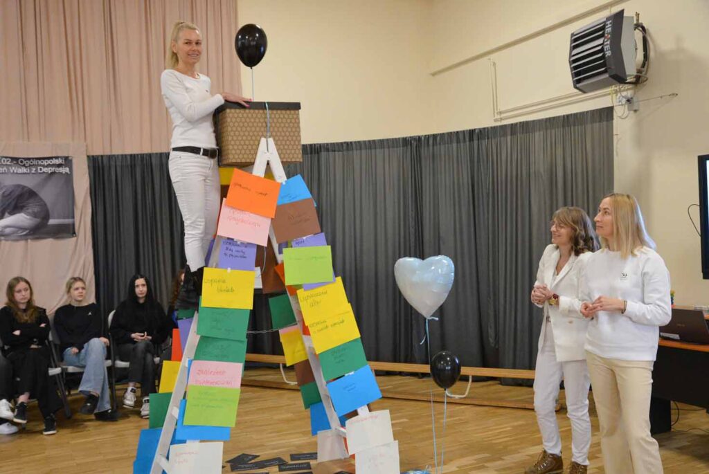 Rosnąca liczba młodych osób doświadczających obniżonego nastroju, przewlekłego stresu i kryzysów emocjonalnych sprawia, że szkoła staje się jednym z kluczowych miejsc profilaktyki zdrowia psychicznego. W związku z tym, nasza Szkoła w dniu 23 lutego 2026 roku dołączyła do akcji „Depresja – Rozumiem – Wspieram” zorganizowanej przez Kuratorium Oświaty w Kielcach w związku z Ogólnopolskim Dniem Walki z Depresją. W tym dniu w ZSP odbyły się wyjątkowe warsztaty. W wydarzeniu wzięli udział uczniowie klas 1M oraz 1e. Spotkanie zostało przygotowane i poprowadzone przez: pedagog Annę Marzec, pedagoga specjalnego Katarzynę Dudę oraz psycholog Monikę Sowę. Tego dnia młodzież ubrała się na czarno – jako symbol trudnych emocji i doświadczeń, natomiast prowadzące na biało – jako znak wsparcia, nadziei i światła. Niecodziennym rekwizytem użytym podczas warsztatów była biała drabina, która symbolizowała drogę do zmiany i możliwość wyjścia z kryzysu.