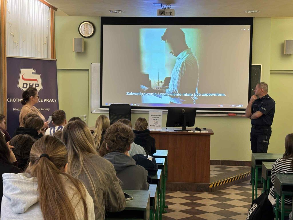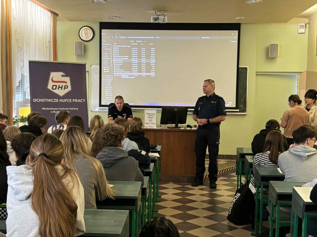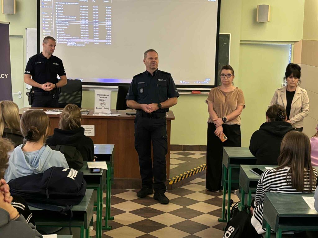 Prelekcję poprowadziła pani Elżbieta Ścióg, doradca zawodowy z Młodzieżowego Centrum Kariery OHP w Busku-Zdroju, wspólnie z przedstawicielem buskiej Policji.