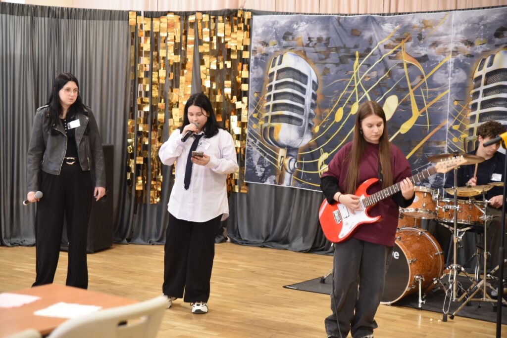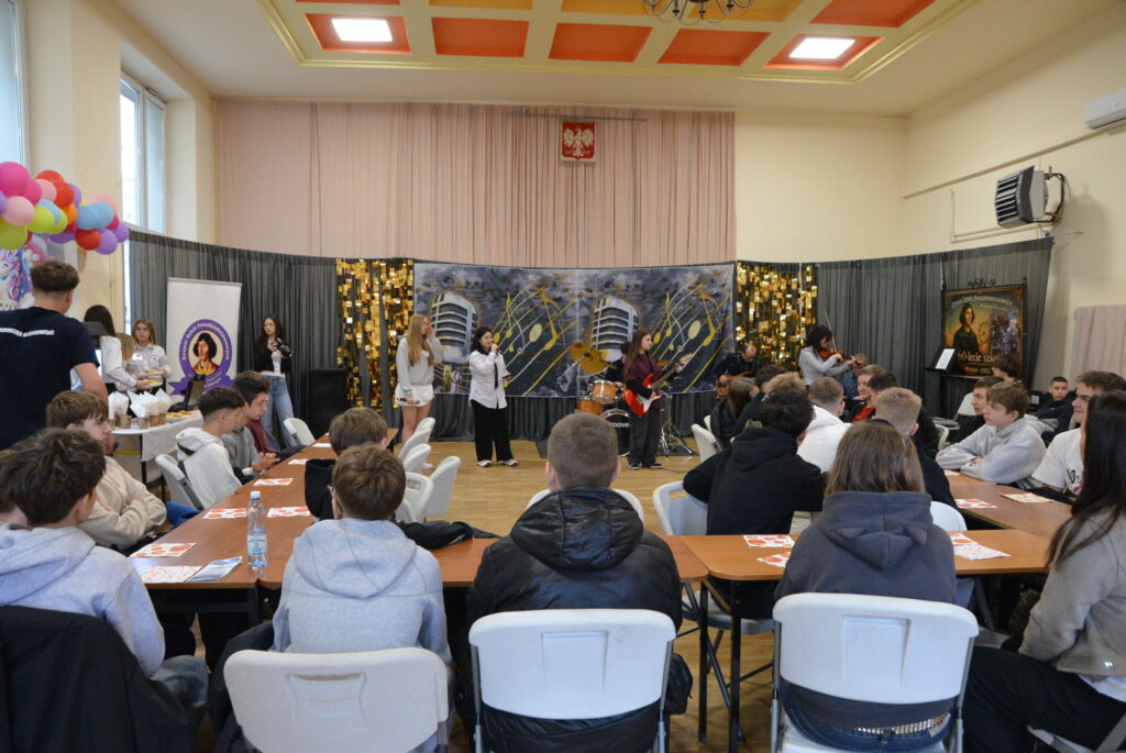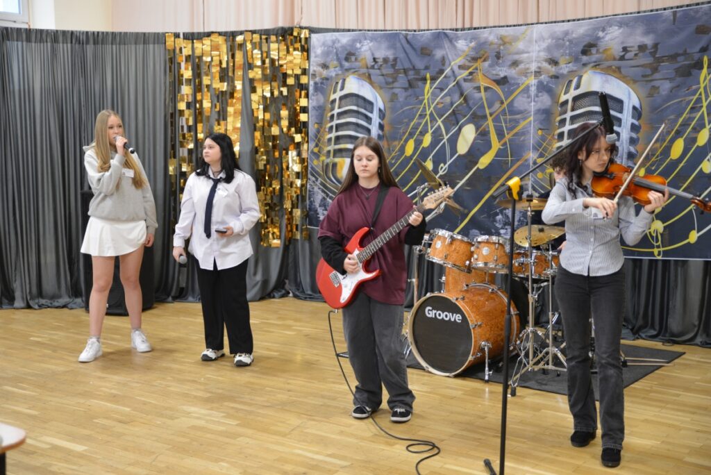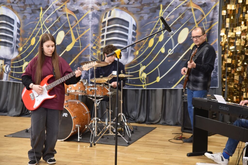 Swoje umiejętności zaprezentował również szkolny zespół muzyczny, uświetniając wydarzenie występami, które stworzyły wyjątkową atmosferę i spotkały się z dużym uznaniem publiczności.