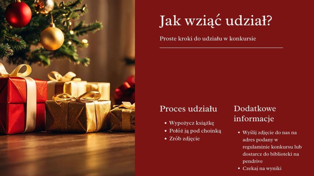 Aby wziąć udział, należy wypożyczyć książkę z Biblioteki Szkolnej, umieścić ją pod choinką we własnym domu, a następnie wykonać zdjęcie przedstawiające książkę w świątecznej scenerii. Fotografię należy przesłać do Biblioteki Szkolnej w sposób wskazany w ogłoszeniu konkursowym.