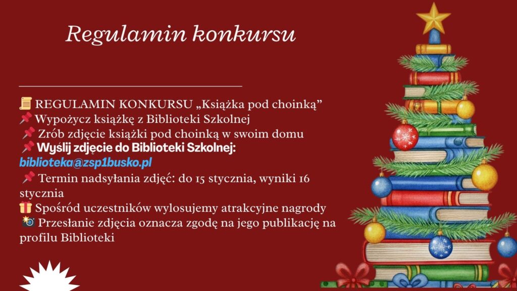 Biblioteka Szkolna zaprasza uczniów do udziału w świątecznym konkursie fotograficznym „Książka pod choinką”. To propozycja dla wszystkich, którzy lubią czytać i chcą połączyć magię świąt z dobrą książką.