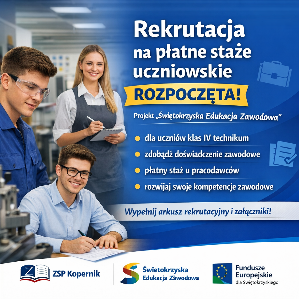 W dniu 04.03.2026 naszej szkole rozpoczęła się rekrutacja na płatne staże uczniowskie realizowane w ramach projektu „Świętokrzyska Edukacja