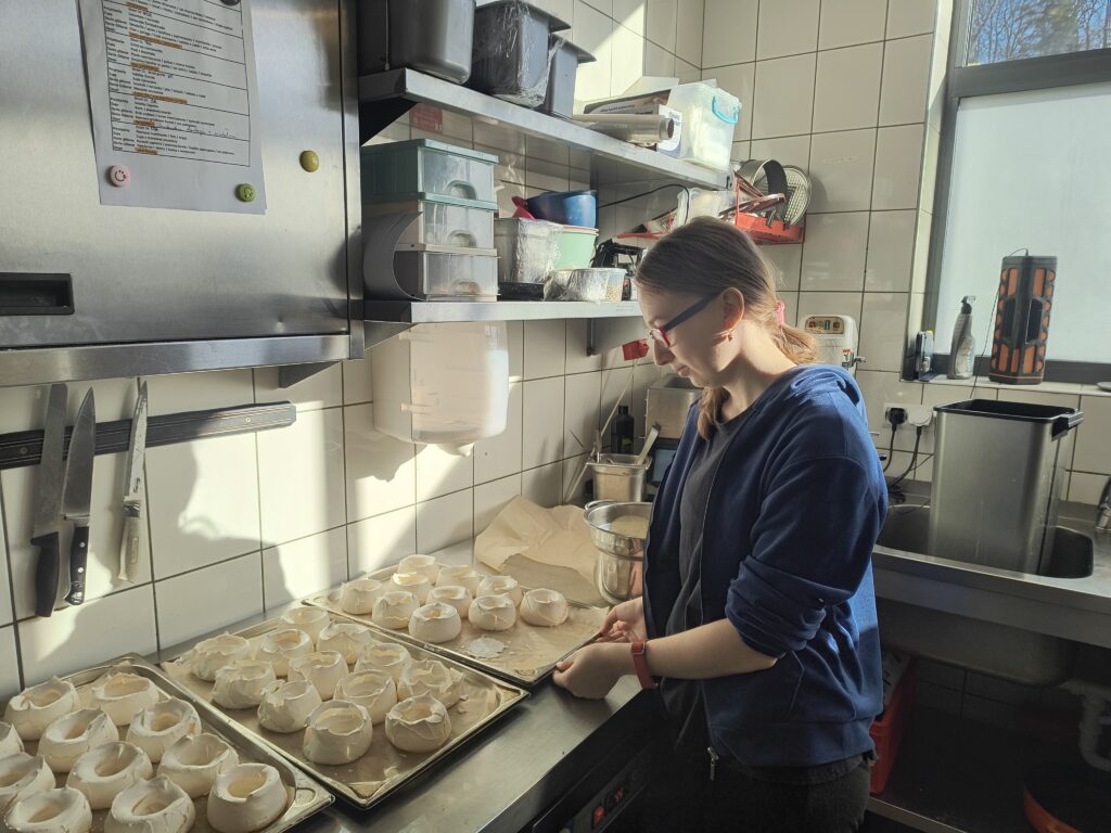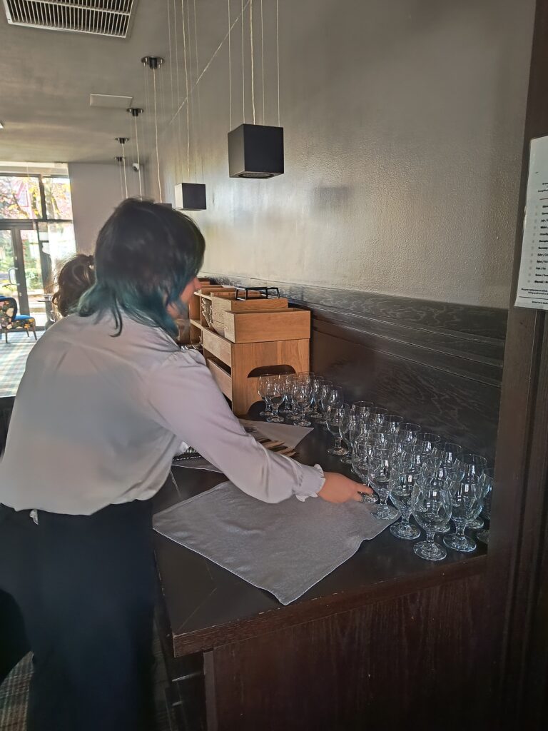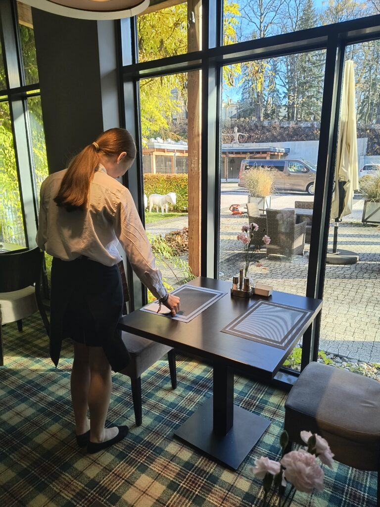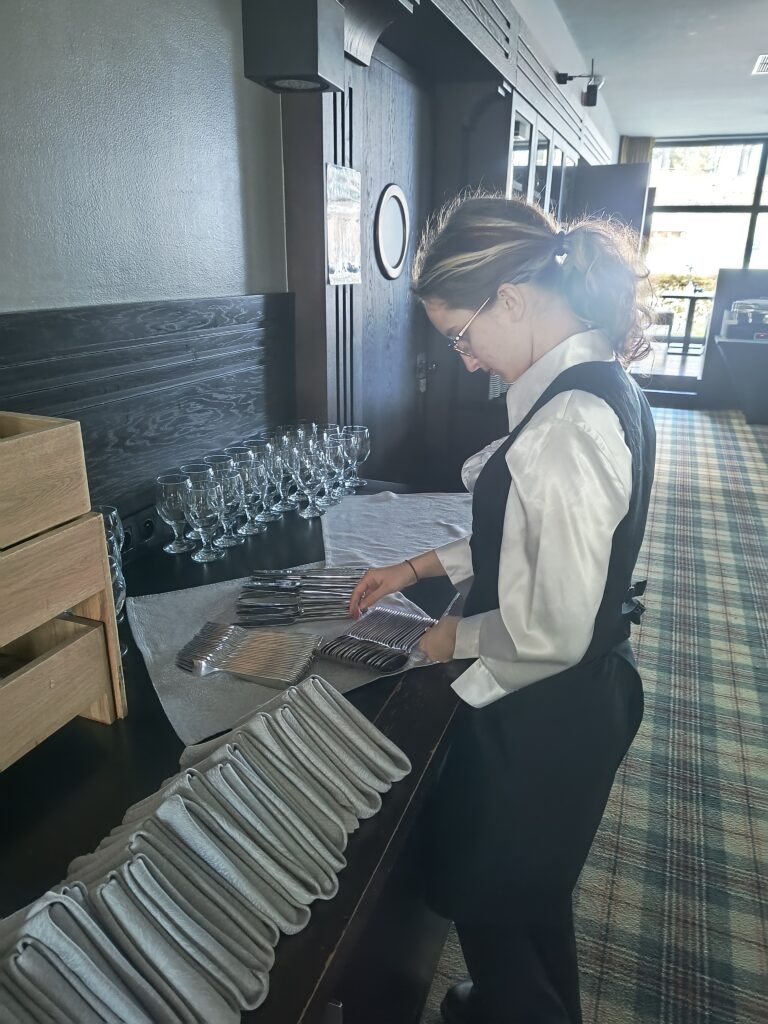 Kolejnym etapem jest przygotowanie sali śniadaniowej. Uczniowie aranżują stoliki, dbając o właściwe nakrycie, dekoracje oraz porządek i harmonię przestrzeni. Ważnym momentem jest także wykładanie potraw na bufet, które wymaga nie tylko precyzji, ale i zmysłu estetycznego — to właśnie pierwsze wrażenie decyduje o komforcie gości.