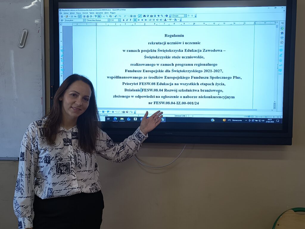 28 lutego w Technikum nr 1 w Zespole Szkół Ponadpodstawowych im. Mikołaja Kopernika w Busku-Zdroju rozpoczął się cykl spotkań z uczniami klas czwartych, których celem jest przekazanie szczegółowych informacji dotyczących rekrutacji na płatne staże uczniowskie realizowane w ramach projektu.