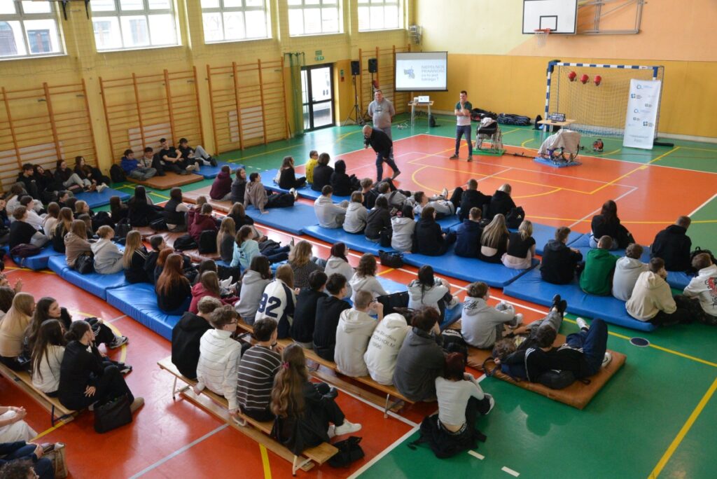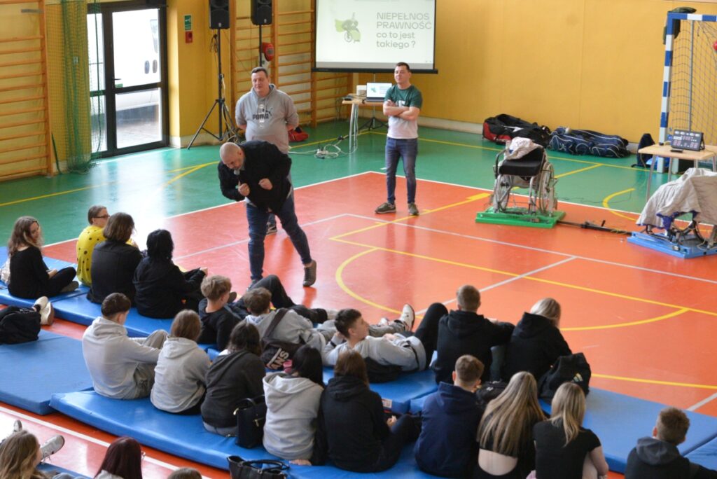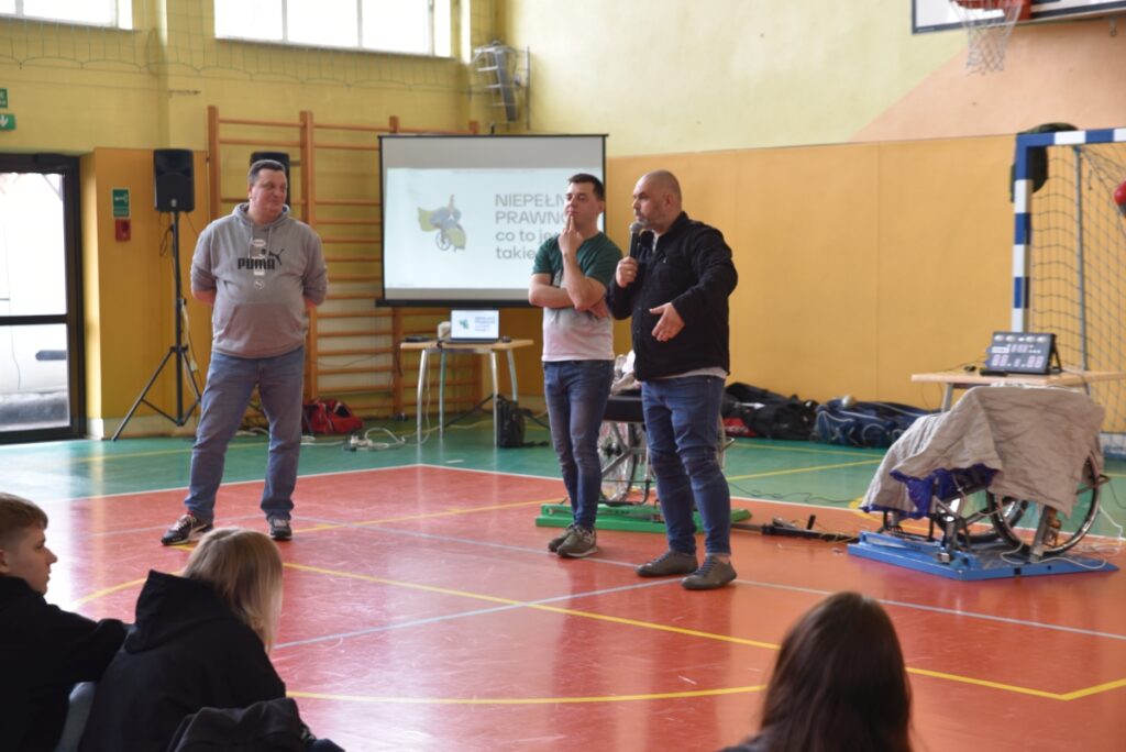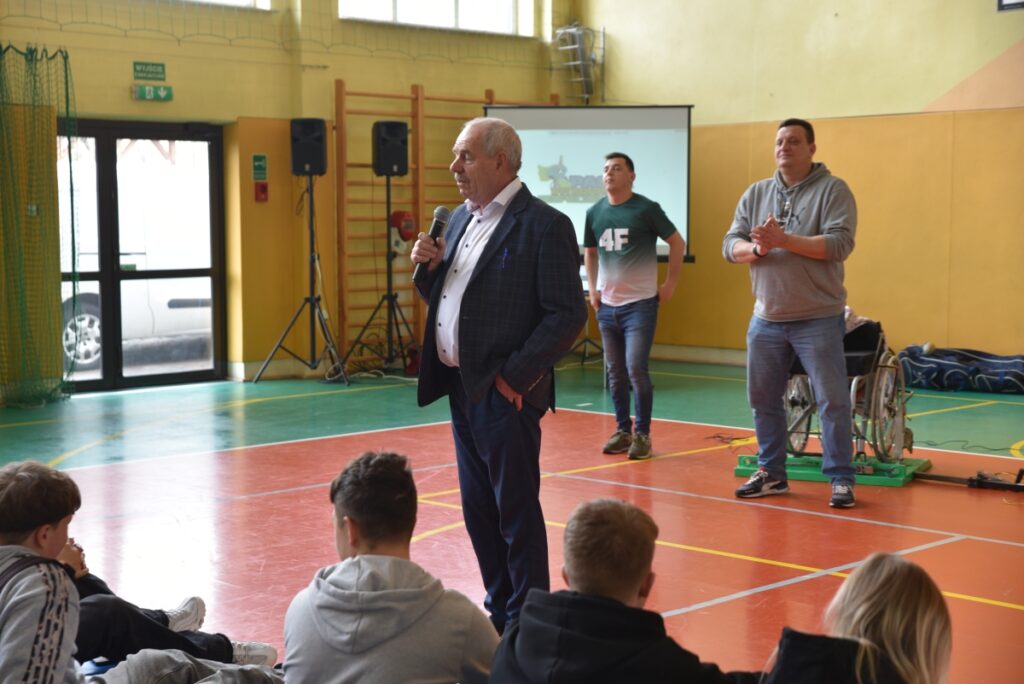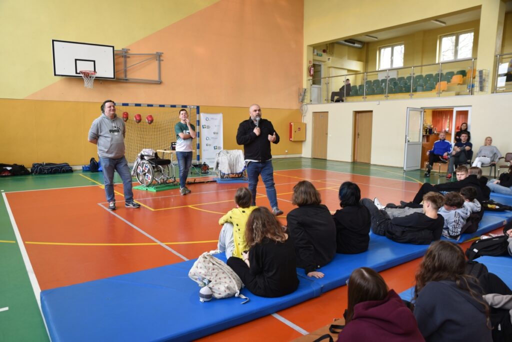 W dniu 16 kwietnia 2026 r. w sali gimnastycznej odbyło się spotkanie profilaktyczne połączone z pokazem szermierki na wózkach, realizowane w ramach programu „Pasja, Integracja, Bezpieczeństwo” pod hasłem: „Niepełnosprawność to nie zawsze przypadek – to często skutek”.Zajęcia miały charakter warsztatowy i zostały przeprowadzone przez niepełnosprawnych sportowców oraz paraolimpijczyków, którzy dzielili się swoim doświadczeniem i promowali postawy oparte na odpowiedzialności, wytrwałości i realizacji pasji