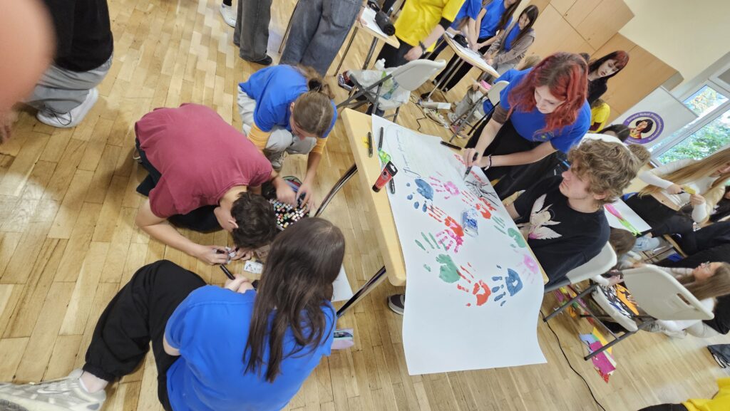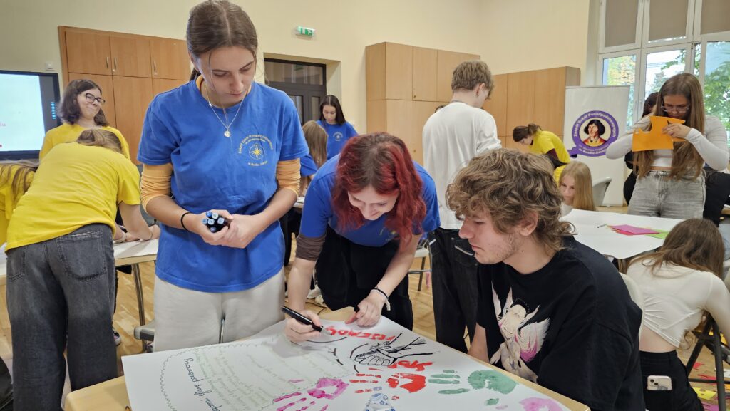 Dnia 1 października 2025 r. w Zespole Szkół Ponadpodstawowych w Busku-Zdroju odbyło się wyjątkowe wydarzenie w ramach obchodów Tygodnia Przeciwdziałania Przemocy Rówieśniczej. Celem akcji było zwiększenie świadomości uczniów na temat różnych form przemocy oraz promowanie postaw empatii, zrozumienia i wzajemnego szacunku. W akcji wzięli również udział uczniowie klasy IV g – Anna, Katarzyna, Magdalena, Jakub i Kamil, którzy wraz z uczniami innych klas przygotowali piękny plakat popierający akcję.