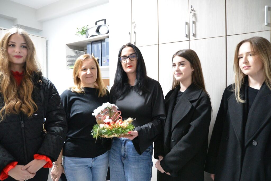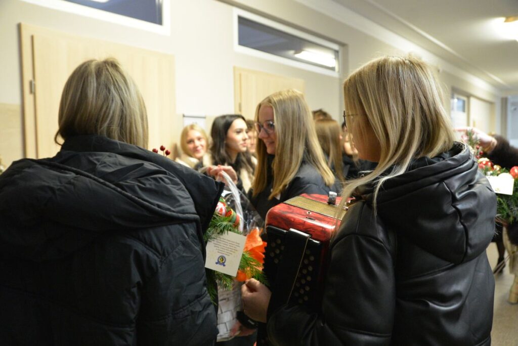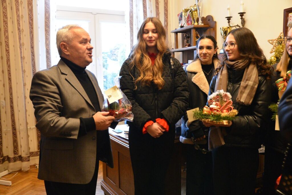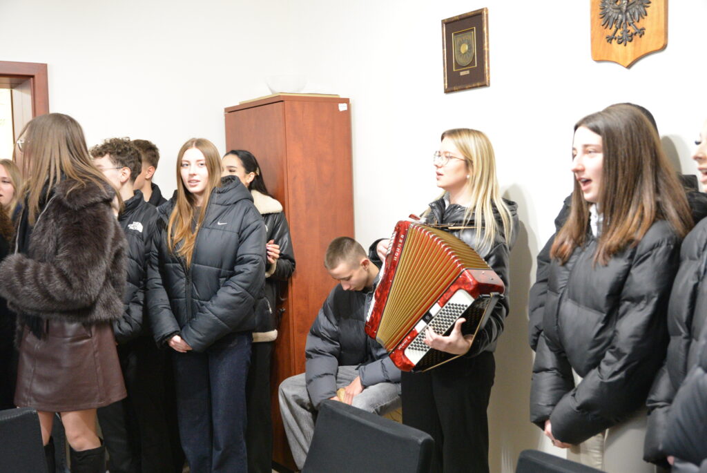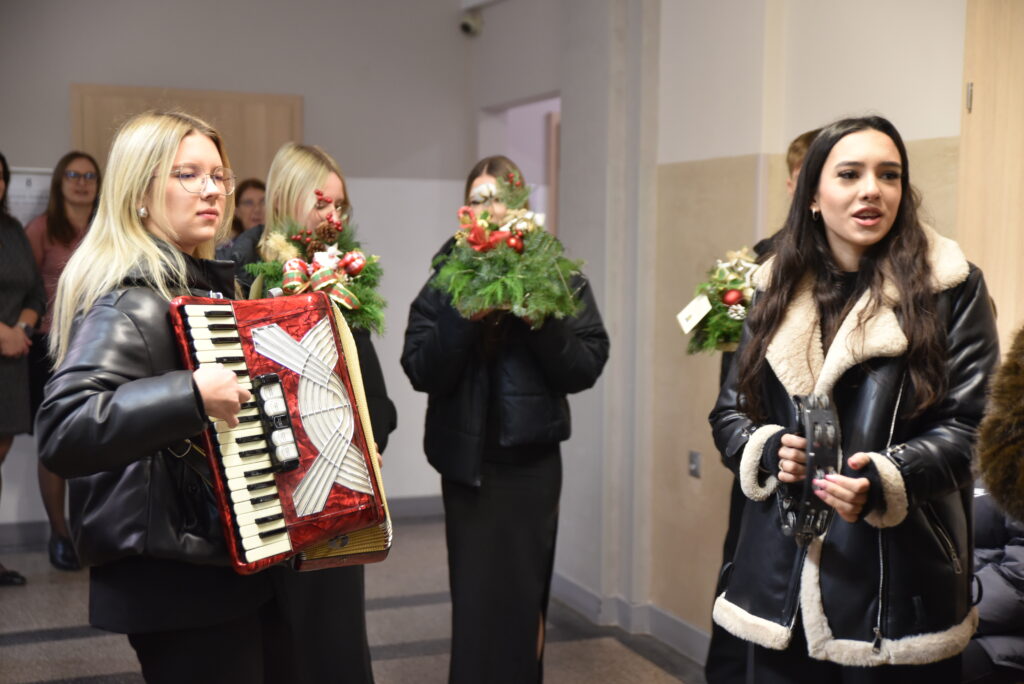 oraz do Pań z Wydziału Edukacji: Edyty Gawor, Marioli Kornickiej i Marioli Prędkiej, którym zaprezentowali kolędy oraz przekazali świąteczne życzenia.