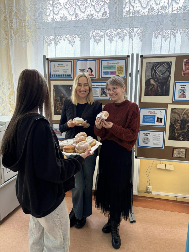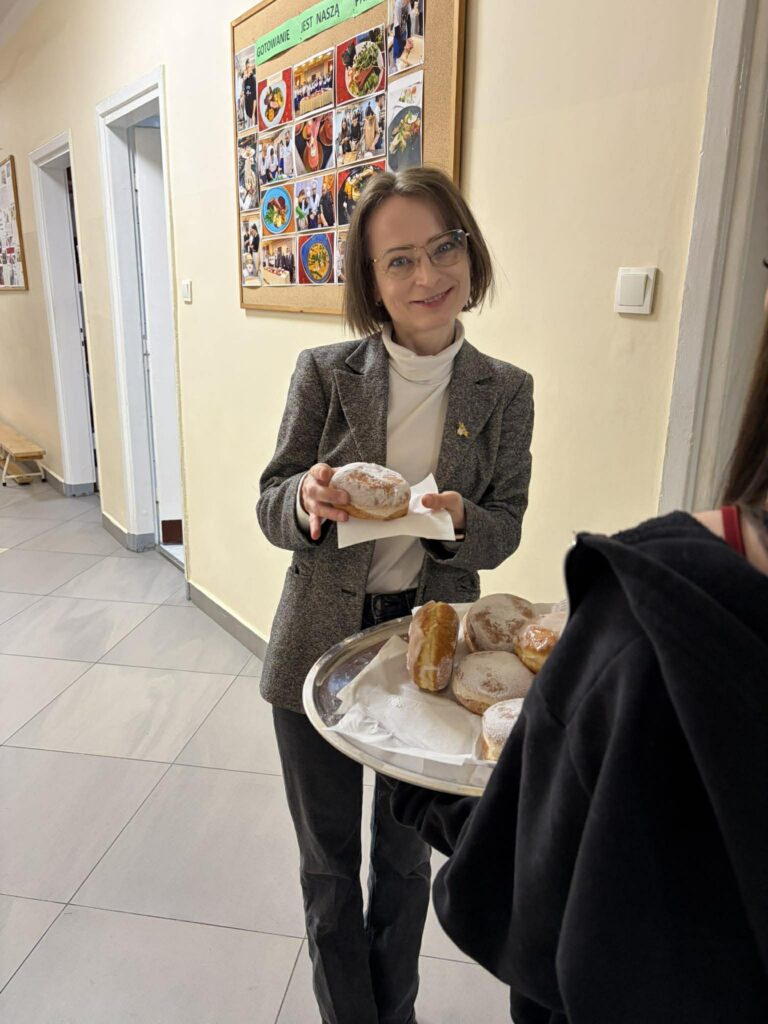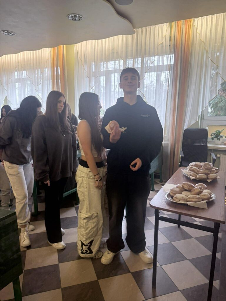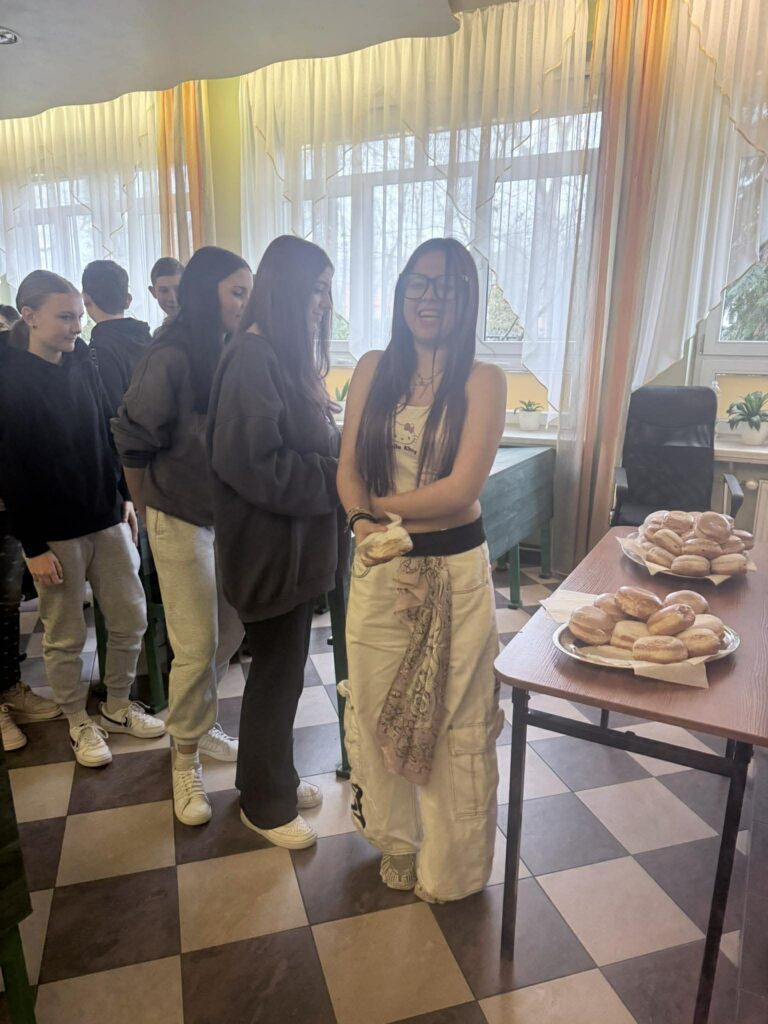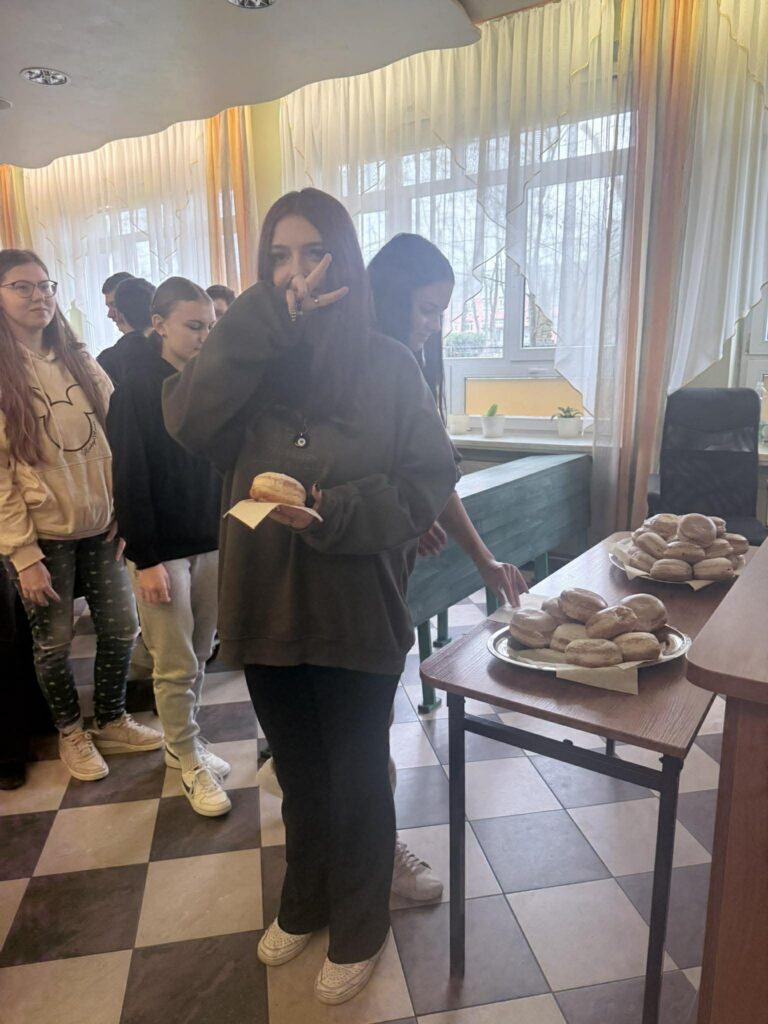 Tłusty Czwartek to jeden z najsłodszych dni w roku – i w naszej klasie nie mogło go zabraknąć! Już od samego rana na szkolnych korytarzach unosił się zapach świeżych pączków. Wydarzenie było nie tylko okazją do kultywowania polskiej tradycji, ale także do integracji uczniów klasy I w. Wspólne świętowanie wprowadziło wszystkich w doskonały nastrój i pozwoliło na chwilę oderwać się od codziennych obowiązków. Tego dnia uczniowie z klasy I w przygotowali miłą niespodziankę dla nauczycieli – częstowali ich pysznymi pączkami, wprowadzając wszystkich w radosny nastrój.