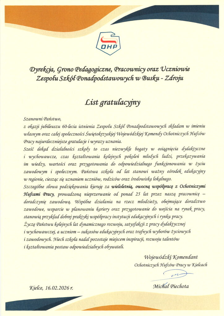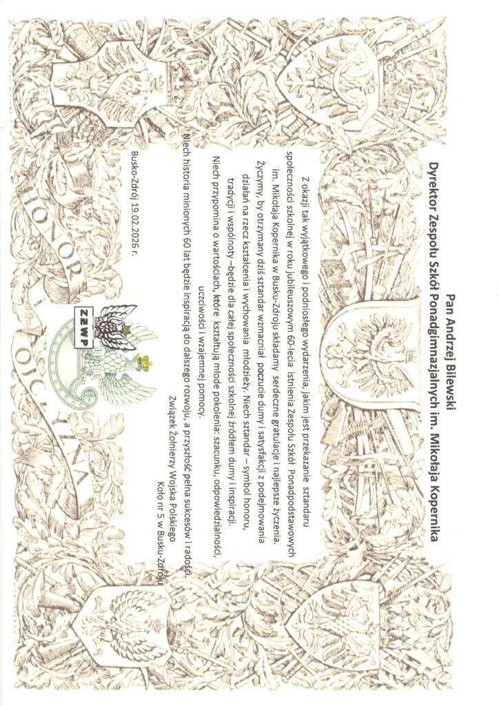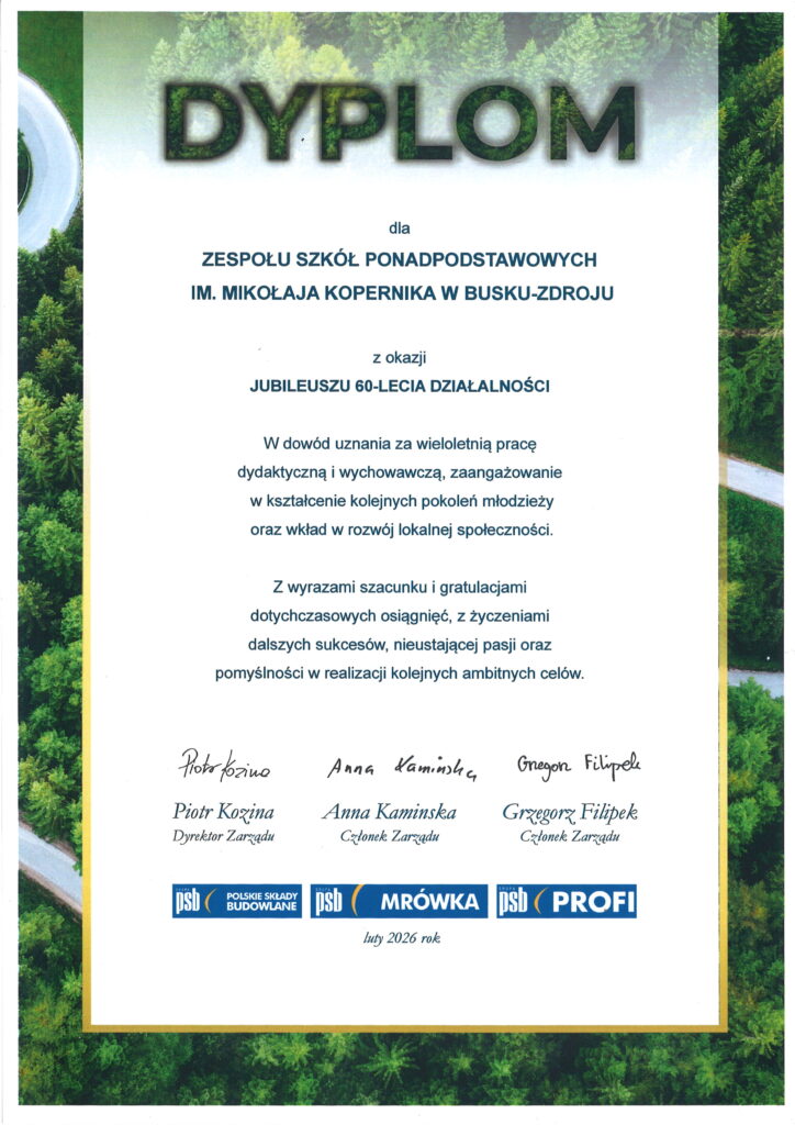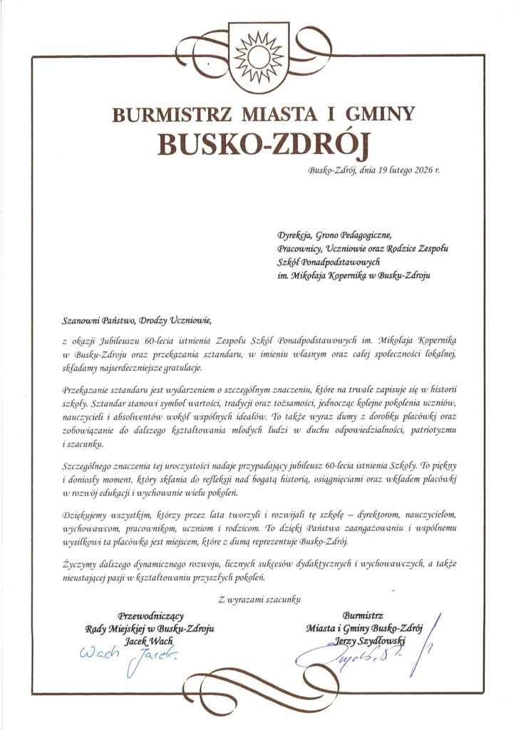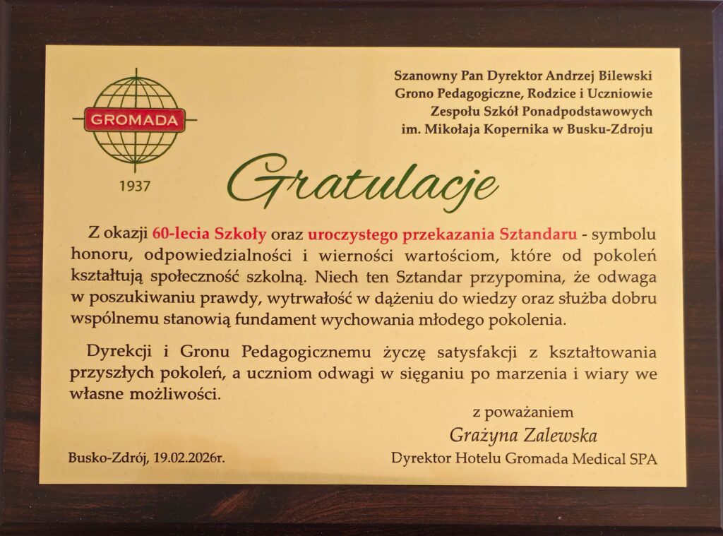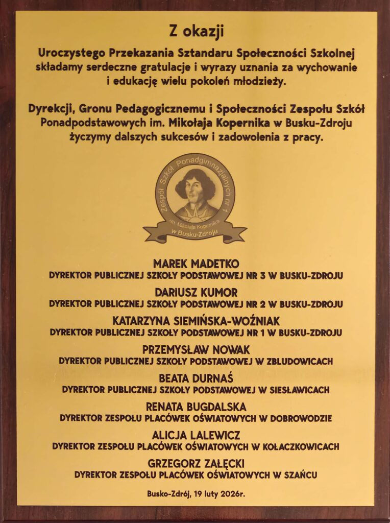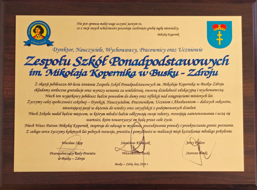 „Sześćdziesiąt lat minęło…” – ten wyjątkowy jubileusz zgromadził społeczność Zespołu Szkół Ponadpodstawowych im. Mikołaja Kopernika w Busku-Zdroju na uroczystej akademii, która odbyła się 19 lutego 2026 roku. Był to dzień pełen wzruszeń, wspomnień oraz dumy z dorobku minionych dekad, a także okazja, by spojrzeć z optymizmem w przyszłość.