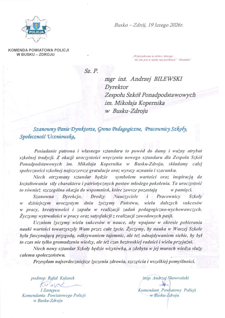 Nowy sztandar oraz wspólne świętowanie jubileuszu stały się symbolem ciągłości tradycji i nadziei na kolejne lata dynamicznego rozwoju. Szkoła im. Mikołaja Kopernika pozostaje miejscem, w którym wartości takie jak odwaga w myśleniu, szacunek do historii oraz dążenie do wiedzy są stale pielęgnowane — dla kolejnych pokoleń uczniów.