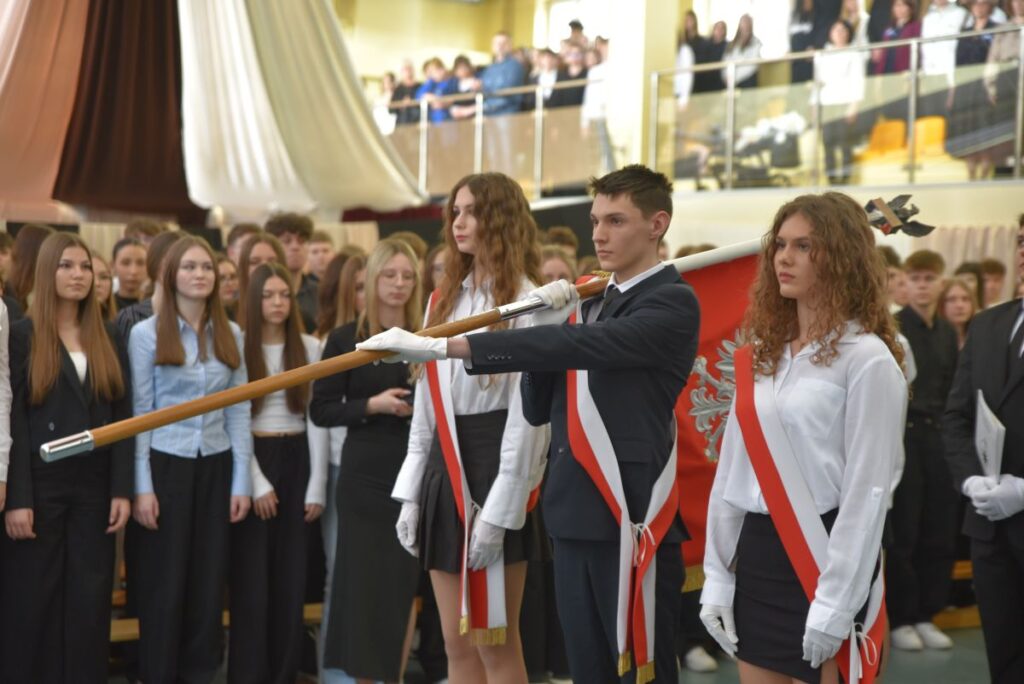 Najbardziej podniosłym momentem obchodów było uroczyste przekazanie nowego sztandaru – symbolu wspólnoty, tradycji i wartości naszej szkoły. Dotychczasowy sztandar, który towarzyszył społeczności szkolnej przez wiele lat, został odprowadzony z należnym szacunkiem, a kolejni uczniowie – wybrany poczet sztandarowy – otrzymali nowy sztandar do swojej opieki.